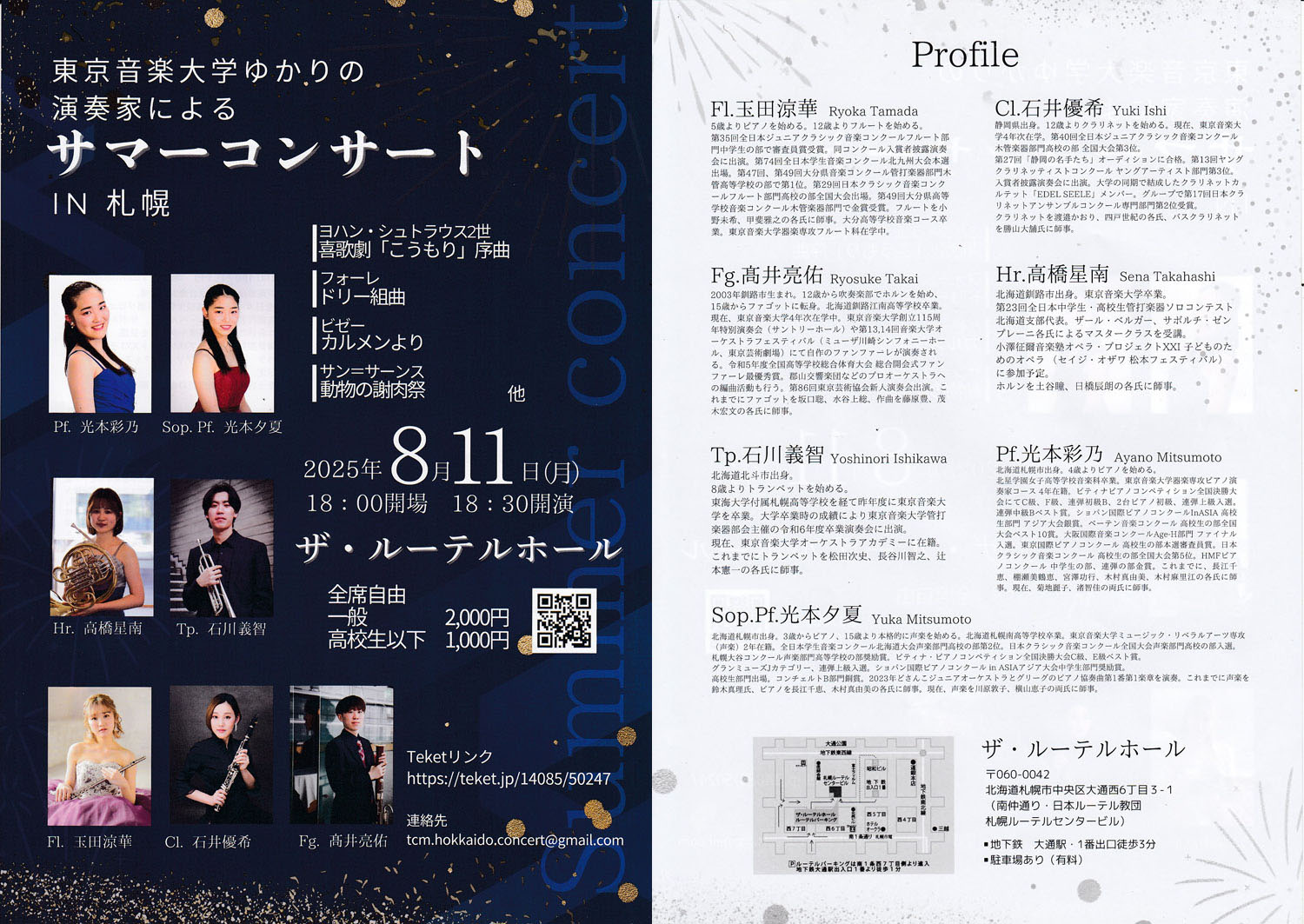 | 東京音楽大学ゆかりの演奏家による「サマーコンサート」IN 札幌 |