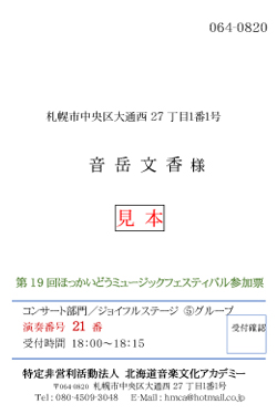 この度は、第19回ほっかいどうミュージックフェスティバルにご参加くださいまして、誠にありがとうございます。関係書類を12月26日の午前に郵送致しました。